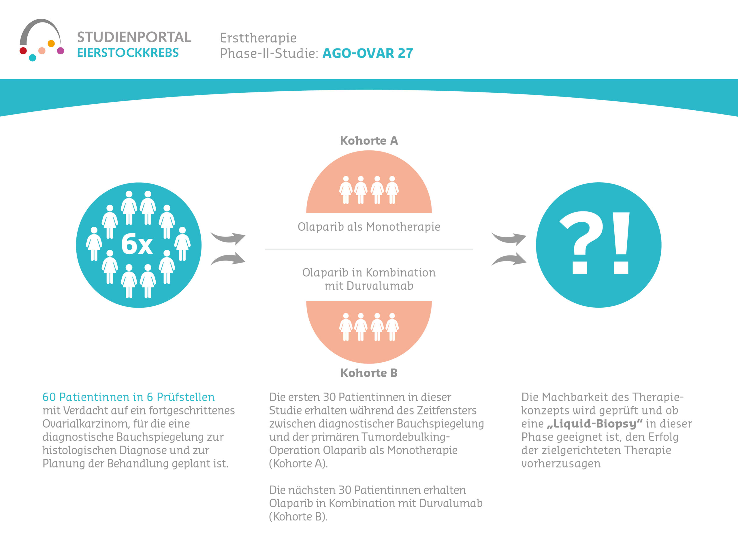 Es handelt sich um eine nichtrandomisierte, open-label Phase II Studie, in der die Machbarkeit einer Behandlung mit Olaparib als Monotherapie oder in Kombination mit Durvalumab während des Zeitfensters („Window-of-Opportunity“) zwischen der Verdachtsdiagnose bzw. der diagnostischen Bauchspiegelung und der primären Operation zur Tumorentfernung untersucht wird. Darüber hinaus soll untersucht werden, ob Änderungen im Profil der zirkulierenden Tumor-DNA (ctDNA) während dieser Behandlungsphase zur Vorhersage einer zielgerichteten Therapie für individuelle Patientinnen geeignet sind.