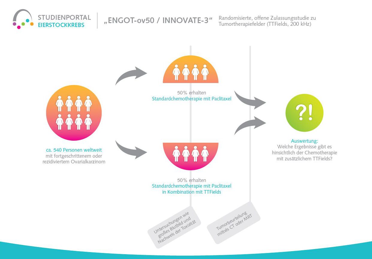 TTFields wurden bereits in einer klinischen Prüfung an Patientinnen mit Eierstockkrebs bewertet (INNOVATE Studie). In dieser Studie wendeten 31 Patientinnen mit wiederkehrendem Eierstockkrebs das NovoTTF-100L-(O)-System am Bauchbereich an. Gleichzeitig erhielten die Prüfteilnehmerinnen eine wöchentliche Dosis Paclitaxel. Das NovoTTF-100L(O)-System wird auch in der aktuellen Studie angewendet und gibt TTFields bei einer Frequenz von 200 kHz ab. Für diese Frequenz konnte in Laborstudien gezeigt werden, dass sie das Wachstum der Eierstockkrebszellen wirksam hemmt. Patientinnen, die mit TTFields mit dem NovoTTF-100L(O) in Kombination mit einer wöchentlichen Gabe von Paclitaxel im Rahmen dieser Studie behandelt wurden, vertrugen die Behandlung gut. Eine meist leichte bis mittlere Hautreizung war die einzige und häufige Nebenwirkung, die mit dem Gerät in Verbindung gebracht wurde.